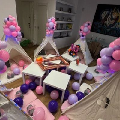 Con impianto musicale e microfono, giochi di accoglienza, laboratorio di braccialetti, giochi musicali, karaoke e balli, momento relax con racconti di storie e scambio di segreti , assistenza alla torta e scarto dei regali